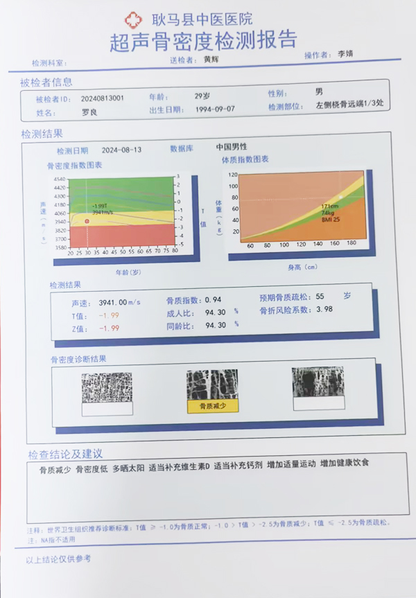 骨密度檢測是評估骨骼健康狀況的重要方法,對于早期發(fā)現(xiàn)骨質(zhì)疏松、預(yù)測骨折風(fēng)險(xiǎn)、監(jiān)測治療效果等具有重要意義。以往,患者需要前往上級醫(yī)院或?qū)I(yè)機(jī)構(gòu)進(jìn)行骨密度檢測,不僅費(fèi)時(shí)費(fèi)力,還可能延誤病情。此次耿馬縣中醫(yī)醫(yī)院引進(jìn)的品源醫(yī)療超聲骨密度檢測儀,具備多部位測量(橈骨、脛骨)和多傳感器探頭的技術(shù)優(yōu)勢,能夠?qū)崿F(xiàn)對不同年齡段人群的全面檢測。其內(nèi)置的少年兒童數(shù)據(jù)庫(0-12歲)、青少年數(shù)據(jù)庫(12-20歲)、成年人數(shù)據(jù)庫(20-80歲)、老年人數(shù)據(jù)庫(80-100歲),使得檢測結(jié)果更加貼合不同人群的實(shí)際情況。