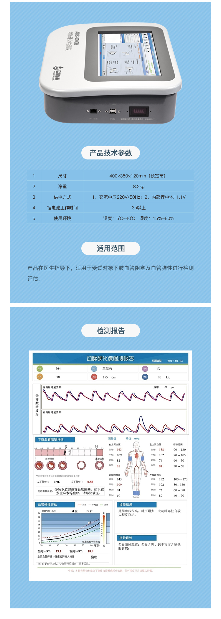 動(dòng)脈硬化檢測儀在臨床上被廣泛應(yīng)用于動(dòng)脈硬化的篩查和診斷。它可以用于評估患者的動(dòng)脈硬化程度和風(fēng)險(xiǎn),以制定更有效的治療方案。同時(shí),它也可以用于觀察患者的病情進(jìn)展情況,以及判斷治療效果。