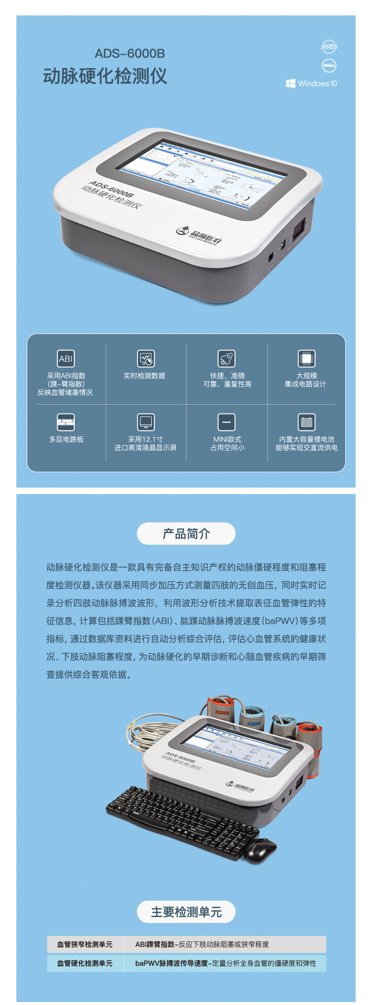 動(dòng)脈硬化檢測儀是一種用于檢測動(dòng)脈硬化程度的醫(yī)療設(shè)備。它可以通過測量動(dòng)脈的輪廓來評估動(dòng)脈的硬化程度,從而幫助醫(yī)生和患者更好地了解動(dòng)脈的健康狀況,以及制定更有效的治療方案。